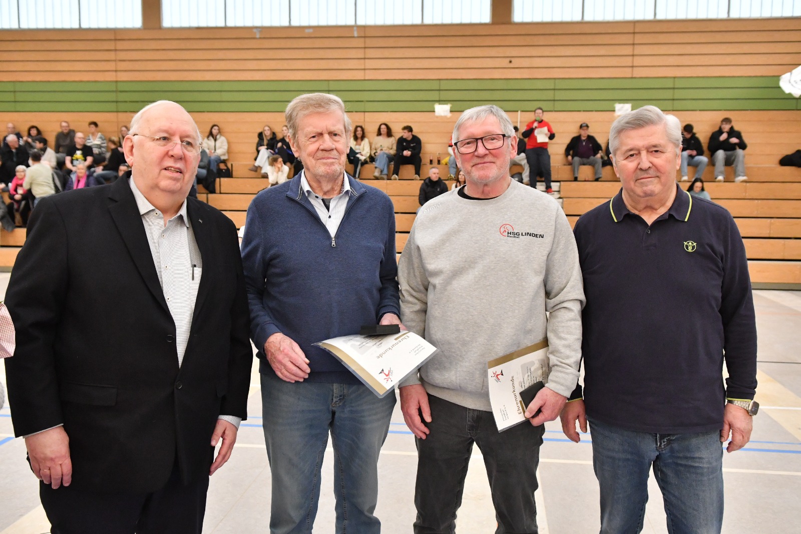 Mit dem Leiter der HSG Linden, Lothar Weigel, und der „treibenden Kraft der HSG Linden“, Ulrich Lepper, wurden zwei echte Handball-Institutionen mit der höchsten Auszeichnung des Hessischen Handball-Verbands (HHV) geehrt. HHV-Präsident Gunter Eckart (Kirchbrombach) verlieh beiden die Ehrennadel in Gold. Vor dem Oberliga Mitte Heimspiel gegen die TSG Oberursel in der Lindener Stadthalle bat der Vorsitzende des TV 1892 Großen-Linden und HHV-Ehrenmitglied Josef Semmelroth, zur Ehrung und würdigte dabei die außergewöhnlichen Verdienste der beiden Geehrten sowie ihren unermüdlichen Einsatz für den Handballsport. „Wir zeichnen heute zwei außergewöhnliche Ehrenamtliche aus, deren jahrzehntelanges Engagement den Handballsport in Linden und weit darüber hinaus nachhaltig geprägt hat“, so Semmelroth.